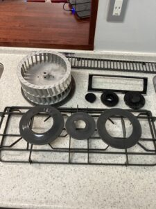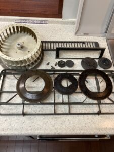 コンロ周りの焦げ付き: 吹きこぼれや油が加熱されて固まった焦げ付きは、ただ擦るだけでは落ちません。プロは専用の洗剤で汚れを浮かせ、素材を傷つけない特殊なスクレーパーで丁寧に除去します。